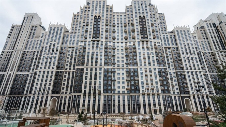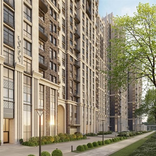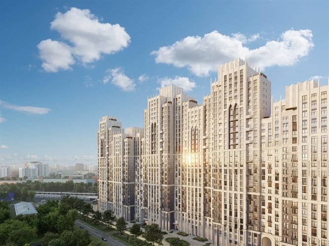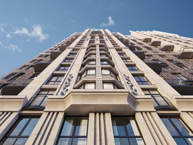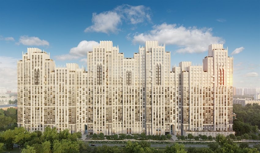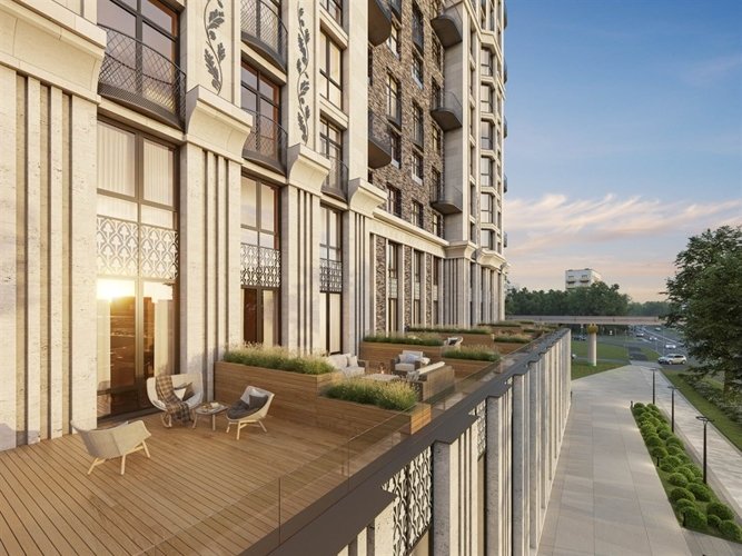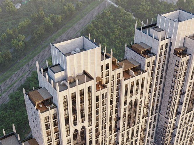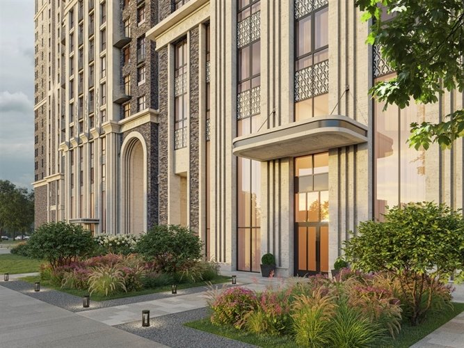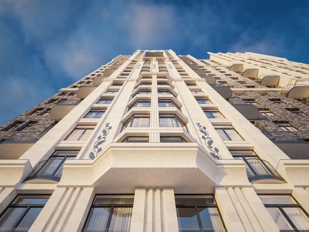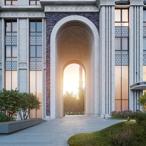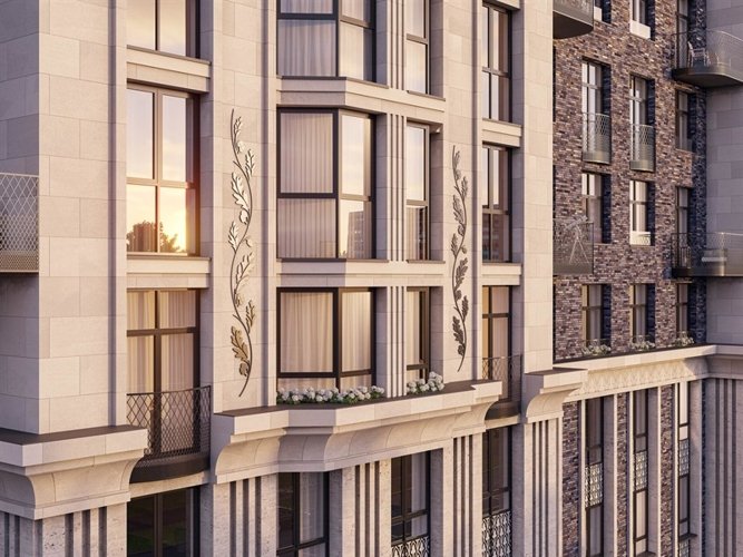 Архитектура дома — современное прочтение торжественного и изящного стиля ар-деко. Элементы неоклассического стиля: карнизы, эркеры, арки, балконы с декоративными металлическими решетками и стремящиеся ввысь пики — все придает дому особую торжественность и подчеркивает его красоту.