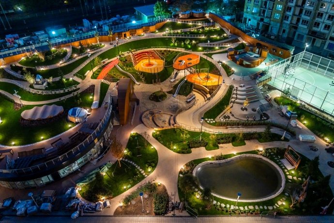 Собственный ландшафтный двор площадью более 1,7 га спроектирован как живописная долина с цветущими кустарниками, взрослыми деревьями, благоухающими луговыми травами, дорожками и мягкой вечерней подсветкой. Скрытая от шума улиц, машин и посторонних людей, территория зеленого оазиса разделена на зоны для спокойного и активного отдыха.