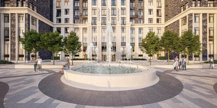 Внешняя часть благоустройства — новый прогулочный бульвар с красивым мощением и озеленением, магазинами и кафе с летними верандами. В центре бульвара - собственный фонтан высотой 5 метров