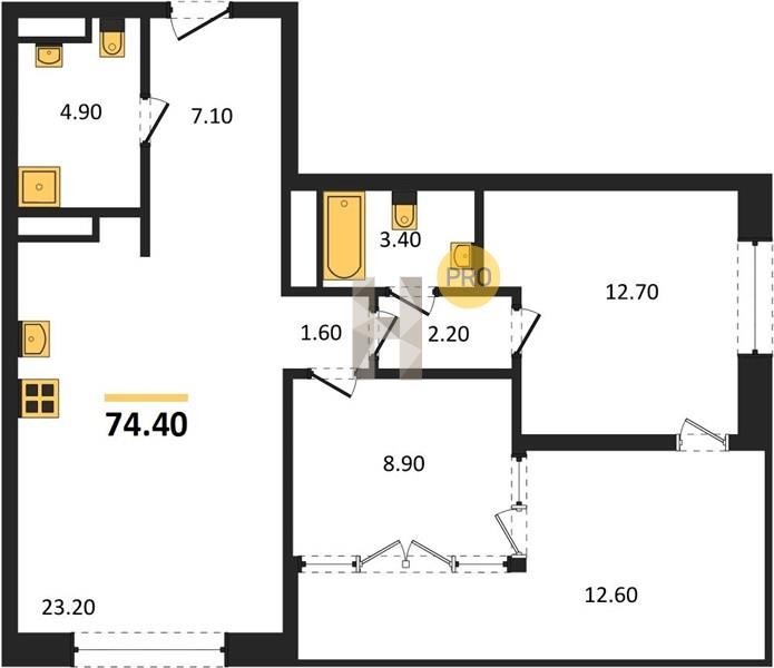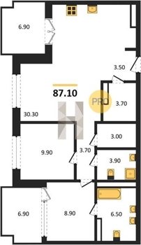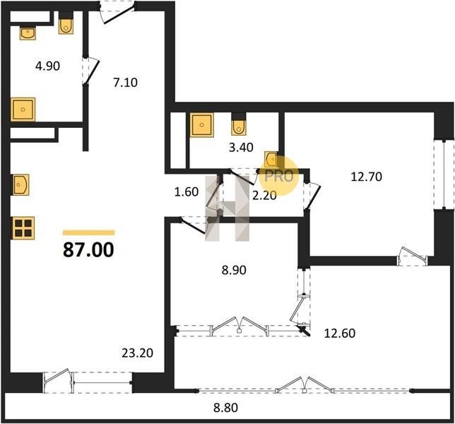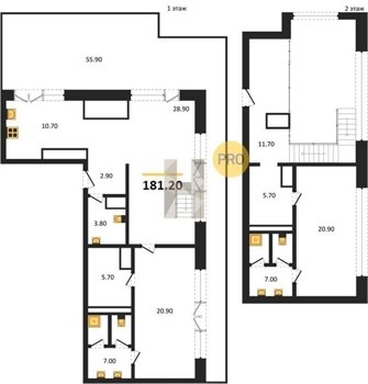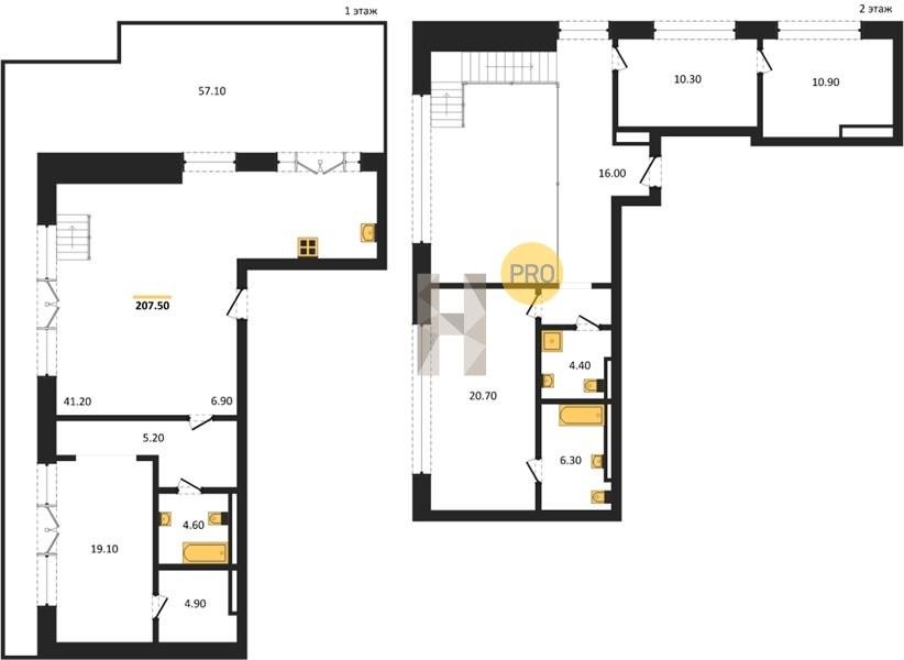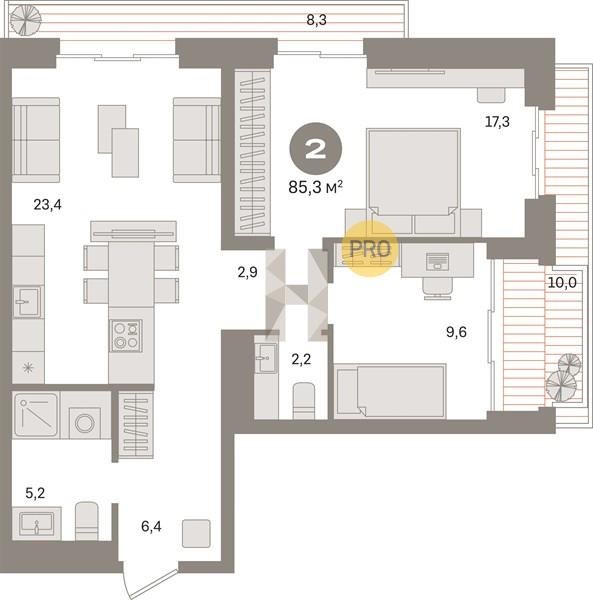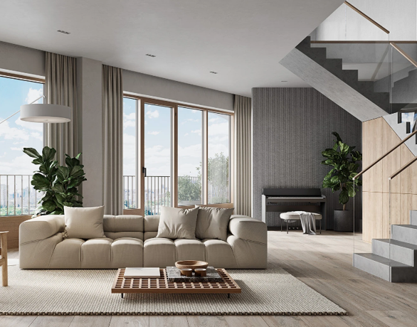 На первых и последних этажах спроектированы двухуровневые квартиры. Нижний этаж квартиры — просторная кухня-гостиная, гостевая спальня и санузел, ниши для хранения на входе. Верхний полуэтаж сделан как антресоль