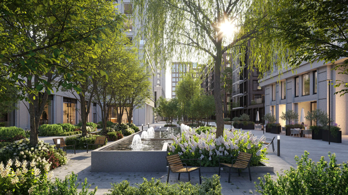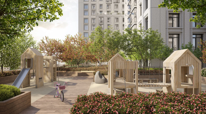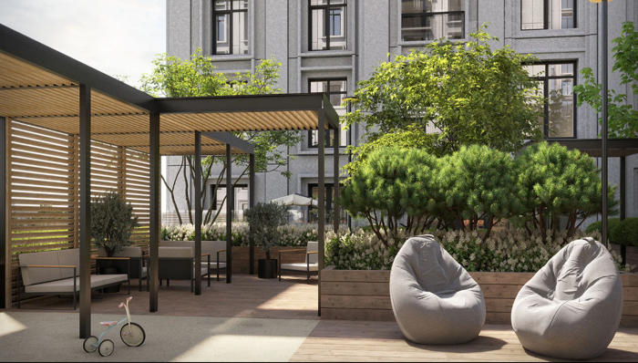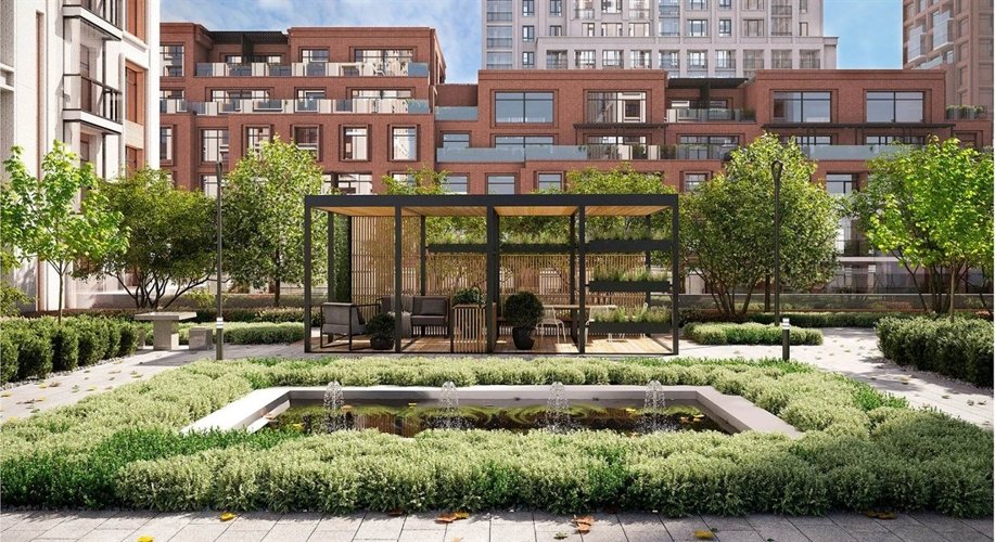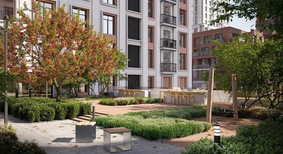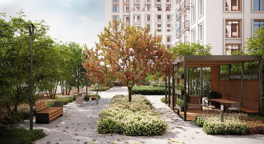 Во дворах будут разобиты камерные сады — тихие и спокойные, в отличие от оживлённых внешних променадов. Взрослые деревья, кустарники, злаковые травы и многолетники, подобранные по календарю цветения, сформируют плотный разноуровневый зелёный каркас, который круглый год будет радовать глаз.