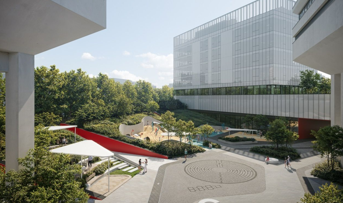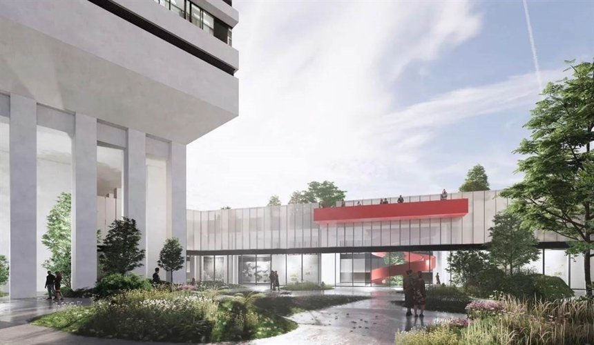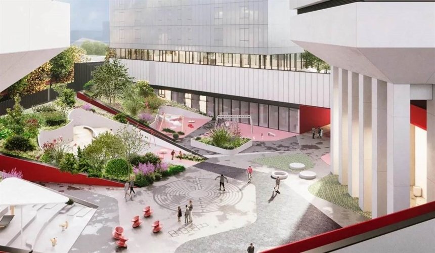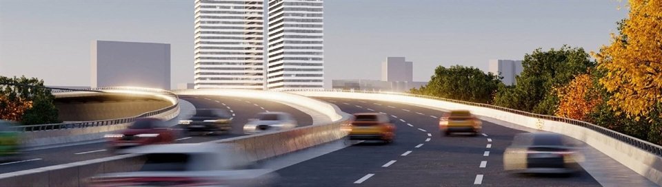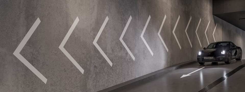 Подземный двухуровневый паркинг на 545 мест с зарядками для электромобилей, зонами хранения велосипедов и постами мойки колес и подкачки шин.
