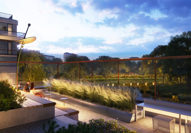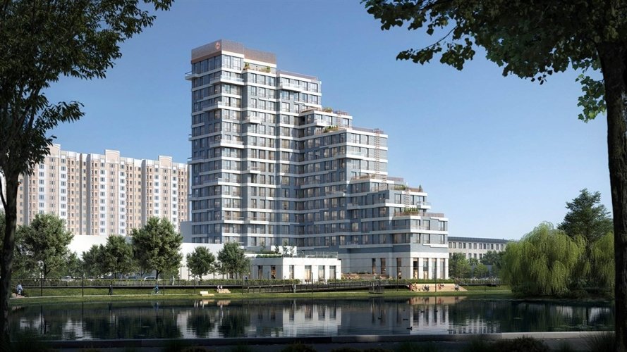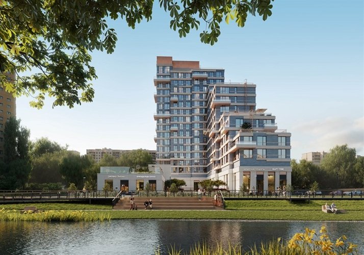 Близость к пруду определила архитектуру и образ здания. Благодаря нескольким уровням террас оно подобно роскошной лестнице плавно спускается к воде. Дымчатые стены смотрятся в водную гладь, а сам пруд словно заглядывает в большие панорамные окна. Живописные виды открываются почти из каждой квартиры.